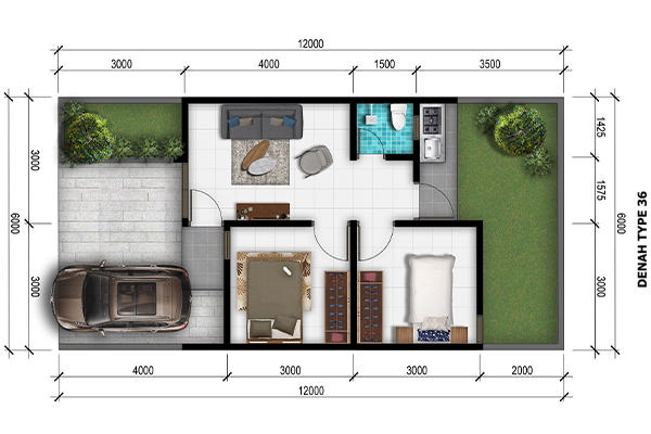Rumah Dengan Luas Bangunan 36 M2 yang dibangun diatas Tanah Standar 72 M2. Ilustrasi diatas digambar pada masa persiapan, pengembang sewaktu - waktu berhak melakukan perubahan tanpa pemberitahuan terlebih dahulu.
